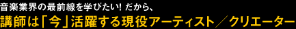 実力あるアーティスト/クリエーター/エンジニアを養成するために、高水準のトレーニングメソッド、最新のプログラムを使って授業を行います。また、契約プロデューサーによる定期的なカウンセリングで、プロとしてのクオリティを追求していきます。