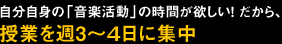 音楽業界のプロを目指すためには、「スクールで学ぶ」ことと同様に、自らの「音楽活動」を積極的に行うことが重要です。その時間を確保できるよう、週3~4日の通学を基本にカリキュラムを組んでいます。