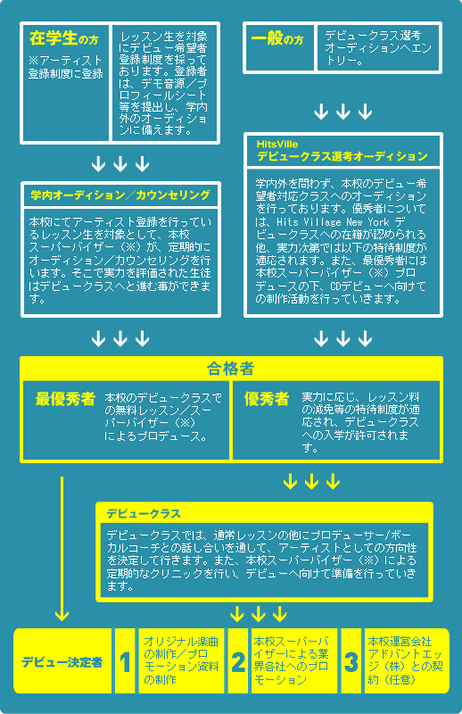 のプロフェッショナルたちが集まりデビュープロデュース/レッスンを行っております。つまり、ただ「デビューをする」という事だけが目的ではなく、実力を
